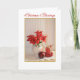 Uma foto de Natal de poinsettias vermelhas no local, emoldurada em ouro, sobre um fundo branco com uma dentro sentimental de saudação para familiares e amigos.