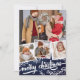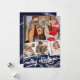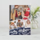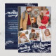 Cartões de foto de Natal de dois lados com uma colagem fotográfica de quatro fotos - uma maior e três menores em quadros brancos quadrados - contra grãos de madeira azul. Feliz Natal está escrito em um roteiro ousado e rodeado de perucas de morango. Nas costas, adicione uma saudação de Natal junto com seus nomes.