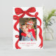 This modern yet festive holiday photo card features a large hand-drawn bow in red over a simple white background. There is one vertical photo and an editable greeting. The back of the card is blank but you could easily add another photo and/or additional text. The background, greeting, and text colors are customizable.