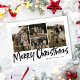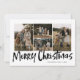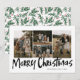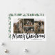 Black Modern Lettering Four Photo Merry Christmas Card (Carta de Natal feliz) apresenta quatro fotos na frente e um padrão verde festivo no verso.
