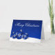 A modern Christmas card featuring blue snowflake Christmas ornaments on a snow background. Shown in blue and white.