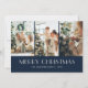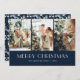 Elegante foto azul Feliz Cartão de Natal com uma colagem fotográfica em um fundo azul escuro. Floresta entonada com raposa, botânica folclórica e ornamentos nórdicos nas costas. Personalize facilmente este cartão mágico de Natal com as suas fotografias e texto.