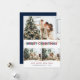 Azul e vermelho personalizados cartões com fotos de Natal Feliz com uma colagem de fotos com um título decorativo e luzes de Natal na frente e fundo azul escuro com queda de neve nas costas. Personalize facilmente esses Cartões de foto de Natal vermelhos e azuis com suas imagens, um nome de família e o ano.