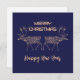 Blue square greeting card wishing a Merry Christmas and a Happy New Year written in English with reindeers with stars and Christmas balls - editable text and background