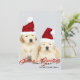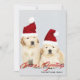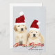 Este design de feriado apresenta uma foto de dois filhotes de Golden Retriever usando chapéus de Natal vermelhos e o texto "Saudações de Fim de Ano" escrito em tipografia vermelha popular com um nome de família adicionado abaixo. O verso do cartão tem um desenho animado de uma rena festiva. Para personalizar, você pode adicionar sua própria foto e editar o texto.