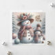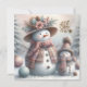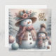 Defenda o frio enviando uma mulher quente de Natal e saudação infantil. A mulher da neve está vestida de azul rosa, verde, e cachecol quente e lindo chapéu de palha floral. Criança tem uma cor similar de chapéu de tricô e cachecol. Esta saudação não deixa de aquecer alguns corações. Modelos no fundo, assim como um "Feliz Natal" no fundo.