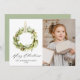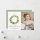 Envie seus cartões de natal queridos com nosso belo cartão de feriado fotográfico. O elegante cartão de feriado apresenta uma coroa aquática de flores de pinheiro, cones de pinheiro e folhas verdes penduradas com fita clara bege. A frase "Feliz Natal" aparece abaixo num roteiro de caligrafia preto e moderno. Personalize a frente do cartão de Natal adicionando seu nome, o ano e uma foto. O cartão reverte para incluir sua mensagem personalizada em um plano de fundo verde de sábio.