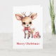 Cartão de Natal com ilustração de um adorável veado bebê. Olhos grandes orelhas com cabeça grande e pequenos galhos castanhos. Vestindo um grande arco vermelho.
