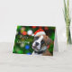 O cão de boxe branco veste um quarto muito pequeno que é um pouco relutante, mas que parece bonito com as luzes brilhantes de Natal no cão de fundo amou o cartão de cartões de natal de Natal