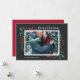 Os cartões com fotos elegantes e festivos de férias enquadram a sua imagem horizontal ou orientada para a paisagem favorita com uma sutil borda decodificada e folhagem vermelha e verde de feriado nos cantos. "Feliz Natal" aparece no canto superior direito na escrita de caligrafia, com seus nomes e o ano no canto inferior esquerdo.