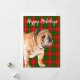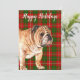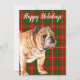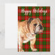 Cartão de Natal com ilustração em aguarela de bulldog fofo em fundo xadrez verde e vermelho festivo e saudação de Natal personalizável.