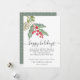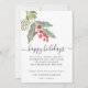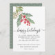 Cartão de férias profissional moderno com elegante escrita caligrafia com leitura de HAPPY HOLIDAYS sob uma aquarela verde de bagas ocas. Abaixo está o espaço para sua mensagem personalizada.