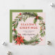 Um cartão de cartões de natal plano, com cor d'água, de uma empresa moderna na moda ou de uma pequena empresa, com uma tipografia ousada "Saudações da estação" em vermelho, com cor de fundo rosa-pincelada. A saudação e o nome da empresa podem ser facilmente personalizados para se adequarem aos seus próprios negócios. O design apresenta uma mensagem opcional para os seus clientes obrigados-os para os seus negócios e lealdade e desejar-lhes paz, prosperidade e alegria no período de férias. Uma design festiva, moderna, divertida e profissional para se destacar nesta temporada de férias!