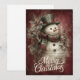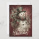 Compartilhe a alegria clássica das festas de fim de ano com este cartão de Natal festivo apresentando um boneco de neve alegre vestido com um chapéu verde com faixa vermelha e um cachecol xadrez vermelho e verde. Cercado por folhas e frutos de azevinho contra um fundo texturizado rico em vermelho, o boneco de neve irradia o espírito da temporada. Letreiro cursivo branco elegante escreve “Feliz Natal”, tornando este cartão perfeito para enviar calor, tradição e charme atemporal.