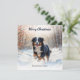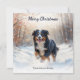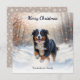 Celebre a temporada com este cartão de Natal do Cachorro da Montanha Bernesa. O cachorro é fotografado correndo alegremente através de uma bela cena de neve de inverno, em um estilo aquarela. No topo está a saudação 'Feliz Natal' na tipografia de scripts, enquanto abaixo está o texto para personalizar com o(s) seu(s) nome(s) ou outra(s) mensagem(ões). Ideal para fãs desta raça de cães leal e amantes de os animais semelhantes.