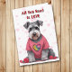 A frente deste cartão de Dia de os namorados bonito tem uma imagem de um adorável cão Miniatura Schnauzer Terrier vestindo seu suéter de Namorados. O texto no topo diz "Tudo que você precisa é de amor" A dentro completa o pensamento e também diz "Feliz dia de os namorados". Todo o texto, frente e dentro podem ser personalizados para qualquer outra coisa que você preferir.