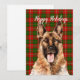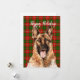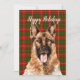 Cartão de Natal com ilustração de aquarela do Pastor Alemão em fundo xadrez verde e vermelho festivo e saudação de Natal personalizável.