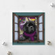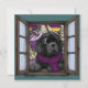 Cachorro da raça Newfoundland desenhado à mão e colorido lindamente, apresentado em um cenário de inverno, olhando através de uma janela com neve