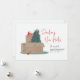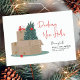 Diga aos seus amigos e familiares que você tem uma nova casa para as férias! Estes cartões de anúncio empinados de 7 x 5 polegadas, desenhados pessoalmente, possuem caixas empilhadas em papelão com árvore de Natal, luzes, ornamentos e uma caixa de presentes com a saudação, "Decking New Halls", em um fundo preto. Simplesmente personalize com seu nome e novo