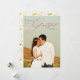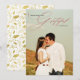 Este lindo cartão de Natal expressa artisticamente os sentimentos de gratidão que muitos de nós temos durante as festas. A frase "Este ano somos muito gratos" está posicionada na parte superior do cartão, com a palavra "Gratos" escrita em bela caligrafia moderna vermelha. O design da tipografia sobrepõe uma foto completa em orientação retrato (ou vertical). Personalize com seus nomes e foto favorita da família. A parte traseira do cartão é decorada com um padrão de folhagem em folha de ouro falso.