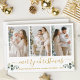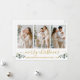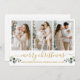 O roteiro de caligrafia moderna Merry Christmas 3 Photo Holiday Card inclui Watercolor Eucalyptus Leaves. Texto Dourado.