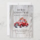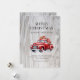 Cartão de Natal em aquarela com um caminhão vermelho clássico carregando presentes de Natal contra um fundo de madeira rústica. Personalize facilmente este cartão de Natal com o nome da sua família e texto.