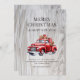 Cartão de Natal em aquarela com um caminhão vermelho clássico carregando presentes de Natal contra um fundo de madeira rústica. Personalize facilmente este cartão de Natal com o nome da sua família e texto.