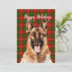 Cartão de Férias com ilustração em aquarela do Pastor Alemão em um fundo xadrez verde e vermelho festivo e saudação de Férias personalizável.
