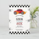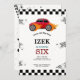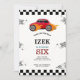 Cartaz de convite de aniversário de criança com tema de corrida, ilustrando um carro vermelho com chamas. O texto diz "junte-se à corrida" desenhada por totkorner.