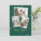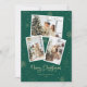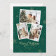 Personalizada fotografia verde e dourada Cartão de Natal Feliz, com uma colagem fotográfica, uma elegante fonte escirpada e fundo verde adornados com neve caindo e flocos de neve. Personalize facilmente este cartão de feriado moderno com as suas fotografias e texto.