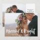 Este simples e elegante cartão de Natal para recém-casados diz "Casados & Brilhantes" em tipografia moderna manuscrita branca com espaço para o seu nome na frente, e uma mensagem pessoal no verso. O cartão tem espaço para duas das suas fotos de casamento favoritas. A maneira perfeita de enviar saudações de Natal do novo Sr. & Sra.