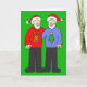 Dois caricaturistas vestindo barbas com os braços um ao outro, se posicionam contra um fundo verde brilhante. Os outros estão vestindo suéteres de Natal.