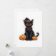 Gato preto, bonito, de olhos verdes, em um traje de bruxa com duas lanternas de Jack-o-Lanterna.