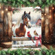 Cartão de Natal personalizado com tema de fazenda com um belo cavalo marrom e branco malhado com um cardeal macho e fêmea no cercado com um celeiro rústico ao fundo de um dia de inverno nevado arte de aquarela ai.