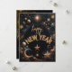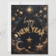 Este cartão de felicitações de Ano Novo deslumbrante apresenta um design com tema celestial com estrelas cintilantes, planetas brilhantes e uma mensagem ousada de "Feliz Ano Novo" em dourado brilhante. O fundo é deixado aberto para permitir uma mensagem personalizada, tornando este cartão o canvas perfeito para transmitir seus sinceros votos para o novo ano. A paisagem cósmica deslumbrante cria uma sensação de maravilha e emoção, capturando a magia de receber o ano novo.