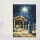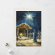 Experimente o encanto do Natal com esta ilustração em aquarela lindamente detalhada da cena da Natividade. Apresentando uma estrela radiante acima de um humilde estábulo, o menino Jesus repousa em uma manjedoura, coroado com um halo suave, enquanto Maria senta-se atrás dele e José permanece de pé observando-os. Ao fundo, pastores e magos se reúnem, prestando homenagem ao rei recém-nascido. Contra um céu escuro e estrelado e ancorada por palha dourada, esta obra de arte captura a beleza tranquila da época, perfeita para adicionar um toque de elegância sagrada à sua decoração de Natal ou presentear.