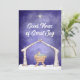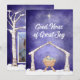 Todo o texto neste cartão fofo pode ser editado. A frente tem uma cena de presépio fofa e uma saudação simples. "Boas Novas de Grande Alegria", mas você pode alterar o texto se quiser. A parte de trás tem espaço para sua própria foto, emoldurada por árvores de bétula, uma pequena árvore de Natal e uma sequência de luzes de Natal.