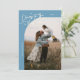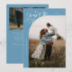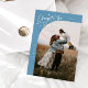 Modern New Year's photo template card featuring a hand written script text that says "cheers to the new year" with a curved frame picture. You can add another picture and a message on the back of the card. Denim blue.