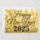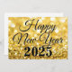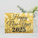 Feliz Ano Novo em tipografia preta elegante sobre glitter dourado. Cartão chique de brilho para desejos de Ano Novo de uma empresa para um maravilhoso 2025. Personalize com o nome da sua empresa para seus clientes ou funcionários nestes cartões de férias modernos.