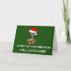 A cute Chihuahua dog sits with his pile of Christmas bones and santa hat. Text says: What do Chihuahuas call Christmas? Inside of card says: Fleas Navidog.