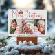 Christmas ornament and red bow three photo collage Christmas Holiday Card. It features a collage of three family photos, a red Christmas ornament with a red bow and branches of fir and the text "Merry Christmas" on grey nackground with snow. The back includes a pattern of Christmas ornaments.