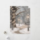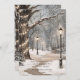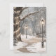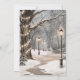 A quiet winter night scene featuring softly glowing street lamps, falling snow, and string lights in a peaceful park setting. This illustrated Christmas card captures a calm, timeless holiday mood. The message reads Wishing you peace, joy, and happiness this holiday season with space to personalize your name or signature at the bottom.