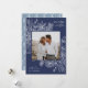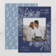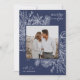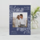 Um cartão de feriado moderno e elegante que enquadra sua foto quadrada em um quadro perfeitamente detalhado com fatias de fruta cítrica, anis estrelado e pinheiros em um rico fundo azul marinho. "Feliz Natal" aparece no canto superior direito, com o nome da sua família na parte inferior. O ano é escondido elegantemente no canto inferior esquerdo da finamente detalhada estrutura botânica branca. Uma natureza delicada e refinada inspirou a escolha para os seus cartões de Natal de 2021.