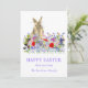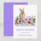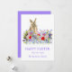 Um cartão de saudação de coelho e felz pascoa de Páscoa com cor d'água, com parte roxa e tipografia. Belos primavera de boho, incluindo flores de cornflores, margaridas e flores de prados de jardim. Pintura moderna à mão em tons azuis, vermelhos, cor-de-rosa, roxos, verdes e lavandas. Fácil de personalizar o moderno script de tipografia de escrita manual para que você possa adicionar seu nome de família e saudações. Arte original da artista Catherine Sweetman