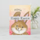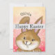 Um coelhinho do estilo cartoon vai animar seus filhos. Eles vão adorar este coelho pintado à mão num fundo rosado e macio. A pintura está em ambos os lados, a parte de trás mostra o coelho escondendo os ovos. Este é rosa e há um azul para o menino. Você também pode encontrar um envelope fofo e uma carta do coelho da Páscoa para as crianças em azul ou rosa na mesma coleção.