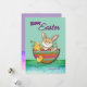 Ilustração de Felz pascoa bonita, pintada manualmente, com coelho de Páscoa na casca de ovo com pintinho. A carapaça rachada e cheia de cores do arco-íris. Atualize facilmente todo o texto ao seu gosto. a parte de trás do cartão tem fundo roxo com uma flor. Felz pascoa!