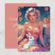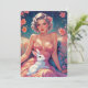 Uma ilustração deslumbrante de uma pin-up com um vestido rosa floral, segurando um coelho branco fofo. Seu penteado retrô, adornado com flores rosa, complementa o fundo floral exuberante em tons de azul-esverdeado e rosa, capturando o charme da Páscoa com elegância vintage.