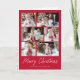 Cartão de férias moderno com 6 fotos organizadas em um layout de colagem. "Feliz Natal" é apresentado num guião branco manuscrito com o nome da sua família e o ano apresentado abaixo num fundo vermelho. Adicione a sua mensagem personalizada ao dentro da placa ou deixe o vazio para escrever o seu próprio cartão. A parte de trás do cartão de feriado multifoto apresenta um padrão de árvore de Natal vermelha e branca.