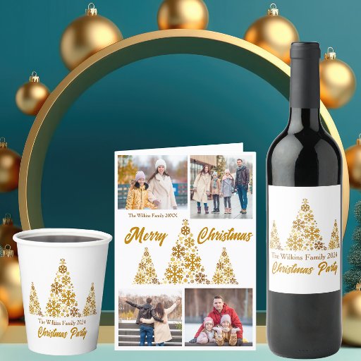 Um cartão de Natal com guião de ouro chic com a sua coleção de fotos da família em volta de uma bela árvore feita de flocos de neve ouro com Feliz Natal e sua mensagem pessoal. Personalize com suas 5 fotos favoritas para crianças e uma fotografia vertical de cheio na parte de trás deste cartão de fenda de neve.