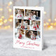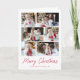 Cartão de férias moderno com 6 fotos organizadas em um layout de colagem. "Feliz Natal" é apresentado num guião vermelho manuscrito com o nome da sua família e o ano apresentado abaixo. Adicione a sua mensagem personalizada ao dentro da placa ou deixe o vazio para escrever o seu próprio cartão. A parte de trás do cartão de feriado multifoto apresenta um padrão de árvore de Natal vermelha e branca.